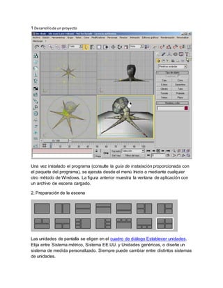 Este documento proporciona una introducción general a las funciones básicas de 3D Max Studio, incluyendo cómo desarrollar un proyecto, preparar la escena, modelar objetos, usar materiales, incluir luces y cámaras, y animar y renderizar la escena. También cubre la administración de archivos, la importación de escenas, y las copias de seguridad.