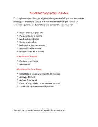Este documento proporciona una introducción al uso del software 3DS Max, explicando cómo crear objetos 3D, aplicar materiales, incluir luces y cámaras, animar escenas y renderizar. Explica los pasos iniciales como desarrollar un proyecto, preparar la escena, modelar objetos, y cubre conceptos como la ventana principal, creación y selección de objetos, modificación de objetos, propiedades de materiales, iluminación y cámaras.