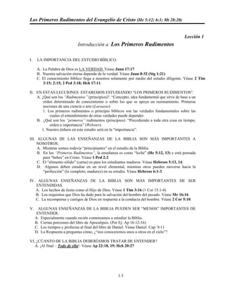 El documento aborda la importancia del estudio bíblico y los primeros rudimentos del evangelio de Cristo, enfatizando que la comprensión de las verdades fundamentales es esencial para el entendimiento de otros aspectos de la fe. También define el pecado, sus implicaciones y la responsabilidad del hombre en la elección del mismo, junto con la visión de Dios sobre el pecado y su plan de redención a través de Cristo. Las lecciones programadas incluyen temas sobre el pecado, el plan de salvación y la iglesia.