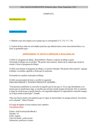 Este documento presenta una serie de actividades prácticas para realizar en clase o como tarea sobre el uso básico de computadoras y procesadores de texto. Incluye instrucciones para crear carpetas, realizar dibujos, agregar texto con diferentes formatos a documentos, y identificar componentes de hardware y software de una computadora.