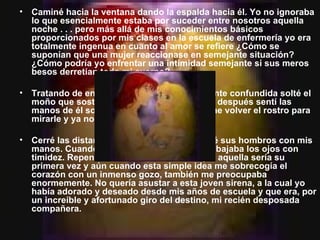 El documento narra el encuentro íntimo entre una pareja recién casada. Expresa la timidez y nerviosismo inicial de la mujer, pero también la ternura y paciencia del hombre para hacerla sentir cómoda. Describe el desarrollo de la pasión entre los dos a medida que exploran su intimidad física y emocional.