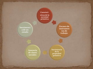 El documento describe cuatro tipos de educación en sociedades primitivas: mágica, doméstica, imitativa y global. También describe las características de las sociedades primitivas, incluyendo la inexistencia de un estado, la ausencia de clases sociales, la escasez de instrumentos de trabajo y la inexistencia de la propiedad privada.