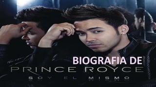 Prince Royce es un cantante estadounidense bilingüe conocido por su atractivo físico e interpretaciones musicales. Nació en el Bronx en 1989 y se interesó por la música y la poesía desde temprana edad, componiendo sus primeras obras musicales en la adolescencia. Ha tenido éxito comercial y aceptación del público por sus mensajes inspiradores y su humildad a pesar de logros.