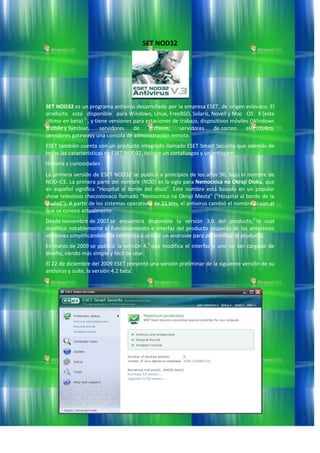 PANDA SECURITY<br />PandaSecurity S.L., anteriormente Panda Software, es una compañía multinacional deseguridad informática fundada en 1990 por el ex director general de Panda, Mikel Urizarbarrena, en la ciudad de Bilbao, en España. Centrada inicialmente en la producción de software antivirus, la compañía ha expandido su línea de aplicaciones para incluir cortafuegos, aplicaciones para la detección de spam y spyware, tecnología para la prevención del cibercrimen, appliances de seguridad y otras herramientas de seguridad y gestión para empresas y usuarios domésticos.<br />Los productos de Panda incluyen herramientas de seguridad para usuarios domésticos y empresas, incluyendo protección contra el cibercrimen y tipos de malware que pueden dañar sistemas de información, como spam, hackers, spyware, dialers y contenido web no deseado, así como detección de intrusiones en redes WiFi. Sus tecnologías patentadas, llamadasTruPrevent, son un conjunto de capacidades proactivas encaminadas a bloquear virus desconocidos e intrusos.<br />En 2009 lanzó Panda Cloud Antivirus,1 ofreciendo seguridad desde la nube gracias a su sistema propietario Inteligencia Colectiva, un sistema automático de análisis, clasificación y desinfección automática contra nuevas amenazas informáticas.<br />SET NOD32<br />SET NOD32 es un programa antivirus desarrollado por la empresa ESET, de origen eslovaco. El producto está disponible para Windows, Linux, FreeBSD, Solaris, Novell y Mac OS X (este último en beta) 1 , y tiene versiones para estaciones de trabajo, dispositivos móviles (Windows Mobile y Symbian, servidores de archivos, servidores de correo electrónico, servidores gatewayy una consola de administración remota.<br />ESET también cuenta con un producto integrado llamado ESET Smart Security que además de todas las características de ESET NOD32, incluye un cortafuegos y un antispam.<br />Historia y curiosidades <br />La primera versión de ESET NOD32 se publicó a principios de los años 90, bajo el nombre de NOD-iCE. La primera parte del nombre (NOD) es la sigla para Nemocnica na Okraji Disku, que en español significa \"