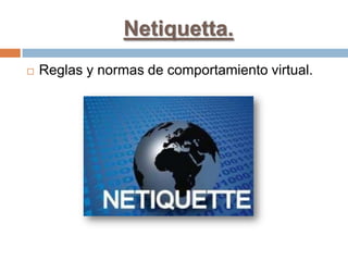 El documento resume los principales aprendizajes sobre la netiqueta, la técnica FODA para el análisis de situaciones, las comunidades virtuales para compartir información y vivencias, y los cursos virtuales, destacando sus ventajas de ahorro de tiempo y dinero pero también sus desventajas como la dificultad de evacuar dudas.