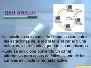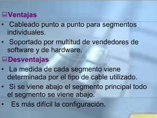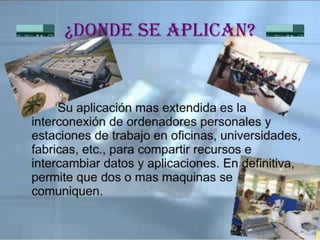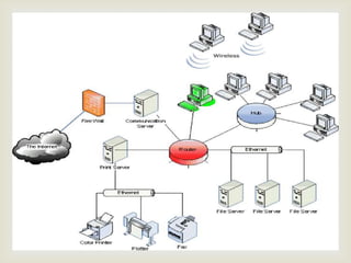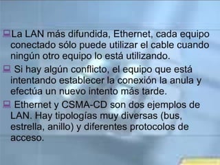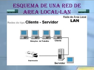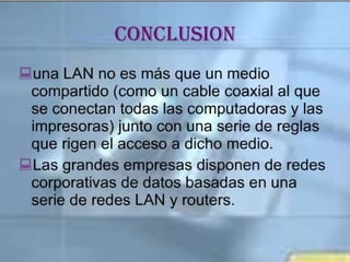 El documento resume los principales temas y conceptos sobre redes LAN, incluyendo las topologías de red más comunes (malla, estrella, árbol, bus, anillo), los equipos y materiales utilizados como cables, conectores y tarjetas de red, y los dispositivos de red comunes como concentradores, switches y puntos de acceso inalámbricos. Además, describe brevemente el área de cobertura típica de una red LAN y algunas de sus características clave.