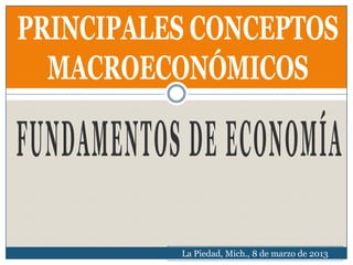 La macroeconomía estudia la economía en su conjunto, analizando variables agregadas como el consumo y producción totales. Algunos conceptos clave son el producto interno bruto, que mide la producción de bienes y servicios, la balanza de pagos, la inflación y el desempleo. El PIB puede calcularse sumando el valor agregado de cada sector o los gastos finales en la economía y representa la actividad económica total de un país. Un crecimiento alto del PIB es necesario para el desarrollo de México pero ha estado por debajo del 6