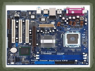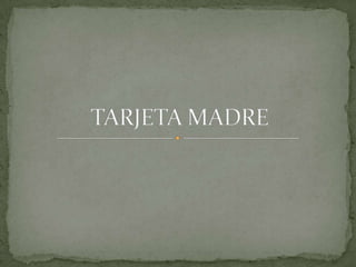La tarjeta madre integra los componentes de la PC como el procesador, memoria, discos duros y unidades de almacenamiento. Proporciona puertos de entrada/salida como audio, video, USB, Ethernet, modem y puertos para periféricos. Contiene slots para el procesador, memoria, tarjetas de expansión y video, así como conectores para la fuente de poder y almacenamiento. El chipset controla los canales y coordina la comunicación entre componentes.