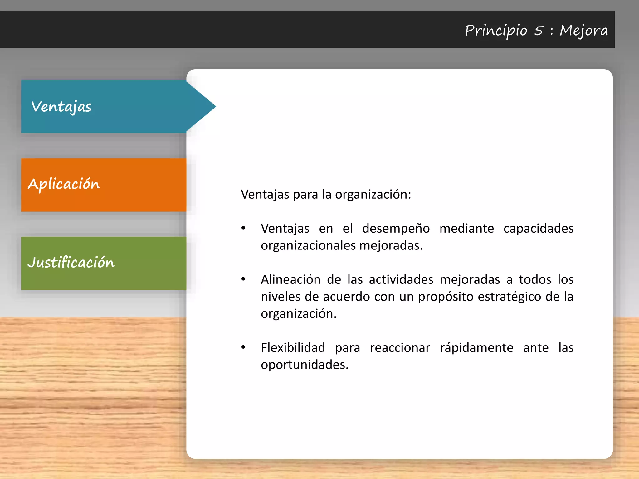 El documento describe las ventajas y la aplicación del principio de mejora continua. Las ventajas para la organización incluyen mejorar el desempeño a través de capacidades organizacionales, alinear las actividades a todos los niveles de acuerdo con el propósito estratégico y tener flexibilidad para aprovechar oportunidades. La aplicación requiere un enfoque consistente de mejora continua, capacitar a las personas en métodos de mejora, establecer metas y medidas, y reconocer las mejoras.