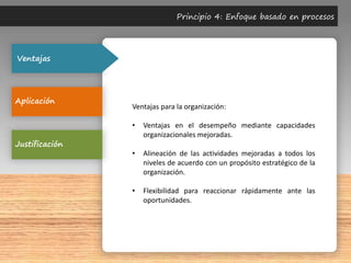 Este documento describe las ventajas de adoptar un enfoque basado en procesos, incluyendo mejor desempeño organizacional a través de capacidades mejoradas, alineación de actividades a todos los niveles de acuerdo con un propósito estratégico, y flexibilidad para responder rápidamente a oportunidades. También detalla cómo aplicar el principio de mejora continua a través de capacitación, establecimiento de metas y mediciones, y reconocimiento de mejoras. Finalmente, justifica que la mejora es indispensable para mantener el rendimiento de