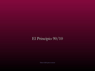 El documento describe el Principio 90/10, el cual establece que solo el 10% de los eventos de la vida están fuera de nuestro control, mientras que el 90% restante depende de cómo reaccionamos. Se ilustra con un ejemplo de cómo una mala reacción a un accidente con café puede arruinar el día, mientras que una reacción positiva puede evitar problemas. El principio enseña que debemos enfocarnos en cómo respondemos a los eventos en lugar de culpabilizar factores externos.