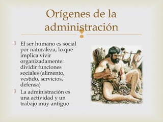 El documento describe la evolución de la administración a través de la historia. Comenzó como una actividad necesaria para la supervivencia humana y la organización social, y se desarrolló en diferentes civilizaciones antiguas como los sumerios, egipcios y romanos. A finales del siglo XIX, la administración emergió como un campo de estudio con las contribuciones de teóricos como Fayol, quien propuso catorce principios de administración. En el siglo XX, las escuelas conductista, de la ciencia de la administración