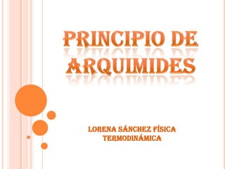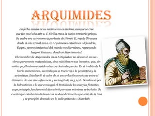 El documento describe el descubrimiento de Arquímedes sobre cómo determinar el volumen de objetos a través del desplazamiento de líquidos. Arquímedes se dio cuenta mientras se bañaba que el volumen de agua desplazado es igual al volumen del objeto sumergido. Luego utilizó este principio para determinar si la corona del rey había sido engañosamente devaluada con plata en lugar de oro puro.