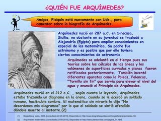 Arquímedes fue un matemático y físico griego nacido en el 287 a.C. en Siracusa, Sicilia. Se trasladó a Alejandría para ampliar sus conocimientos, especialmente en matemáticas. Descubrió teorías sobre cálculos de áreas y volúmenes y inventó máquinas como la polea y el tornillo sin fin. Enunció el Principio de Arquímedes, que establece que todo cuerpo sumergido en un líquido recibe una fuerza hacia arriba igual al peso del líquido