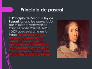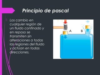 El Principio de Pascal establece que los cambios de presión en cualquier parte de un fluido se transmiten igualmente a todas las demás regiones. Se puede demostrar usando una esfera hueca llena de agua, donde al aplicar presión en un punto, el agua sale con igual presión por todos los orificios. La prensa hidráulica aprovecha este principio para multiplicar fuerzas aplicando una menor fuerza sobre un émbolo más pequeño.