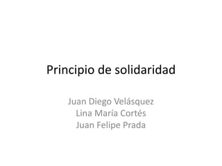 El documento describe el principio de solidaridad según las fuentes de Vatican.va y Catholic.net. La solidaridad se basa en la conexión entre personas y en preocuparse por el bien común. Implica tanto un principio social de ordenar las relaciones entre personas como una virtud moral de comprometerse con el bienestar de los demás. La solidaridad y la subsidiariedad son principios fundamentales para la configuración social.
