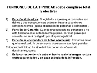 El documento describe los principios de tipicidad, culpabilidad, proporcionalidad y humanidad de las penas en el derecho penal. El principio de tipicidad establece que solo conductas claramente descritas en la ley pueden ser consideradas delitos. Los principios de culpabilidad y proporcionalidad establecen que la pena debe estar justificada por la gravedad del delito y ajustarse a la culpabilidad del ofensor. Finalmente, el principio de humanidad prohíbe las penas crueles, inhumanas o degradantes.
