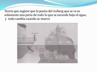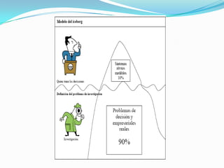 El documento habla sobre el principio del iceberg en el mercado y cómo resolver problemas y tomar decisiones. Explica que solo se ve la punta del iceberg y que hay más debajo de la superficie. También menciona que la investigación de mercados es un proceso sistemático para recopilar datos e interpretarlos para que las empresas puedan tomar mejores decisiones. Además, señala que la mayoría de los problemas verdaderos de una empresa están debajo de la línea de observación y son invisibles al 10% y que se necesita una visión del 100%