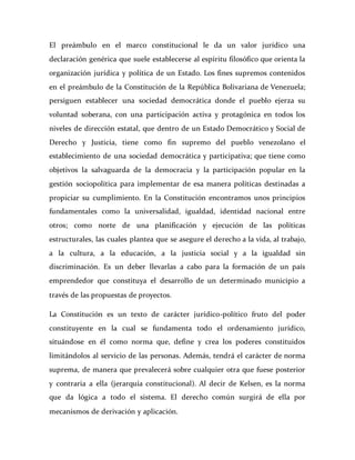 El documento aborda el valor jurídico del preámbulo de la constitución de la República Bolivariana de Venezuela, destacando su papel en la organización y funcionamiento del estado democrático. Se mencionan principios fundamentales como la legalidad, la supremacía constitucional y la separación de poderes, así como la clasificación de las personas jurídicas en derecho público. Además, se describen los cinco poderes del estado venezolano: legislativo, ejecutivo, judicial, ciudadano y electoral.