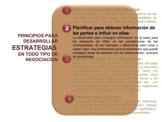 El documento describe principios para desarrollar estrategias en negociaciones. Explica que se debe adaptar la estrategia a cada situación, planificar para obtener información de las otras partes e influir en sus percepciones, y marcar las reglas de la negociación desde el principio del proceso. También enfatiza la importancia de organizar para mejorar continuamente las habilidades de negociación.