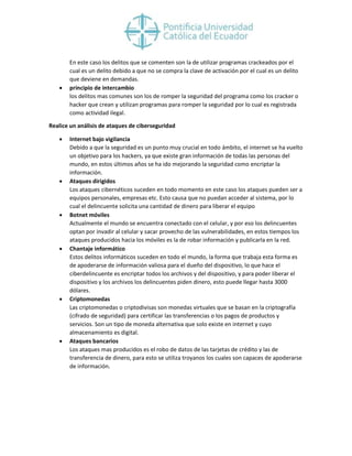 El documento describe los principios de la informática forense aplicados a casos de delitos informáticos. Explica principios como la identidad propia, la protección y preservación de evidencia, la identidad impropia, el enfoque transdisciplinario, la oportunidad, la compatibilización legislativa internacional, la vinculación estricta y el intercambio. También analiza ataques de ciberseguridad como el internet bajo vigilancia, ataques dirigidos, botnets móviles, chantaje informático, criptomonedas y ataques