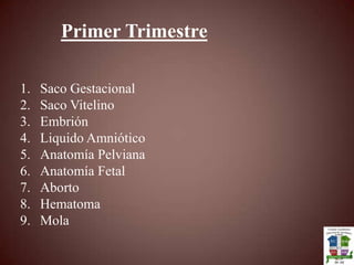 Este documento proporciona información sobre principios básicos de ecografía obstétrica. Explica los hallazgos ecográficos esperados en cada trimestre del embarazo, incluyendo estructuras como el saco gestacional, saco vitelino, embrión y más. También describe posibles anomalías y cómo evaluar la edad gestacional, anatomía fetal, placenta, liquido amniótico y otros aspectos importantes para monitorear el embarazo a través de ecografía.