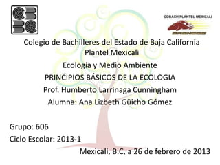 Este documento presenta los principios básicos de la ecología. Explica que la ecología estudia las interacciones entre los seres vivos y su ambiente, mientras que la educación ambiental busca crear conciencia sobre problemas ambientales. También define términos clave como autoecología, demografía, sinecología y las ciencias auxiliares a la ecología como la física, química y geografía. Concluye resaltando la importancia de comprender estas relaciones ecológicas y de que los humanos formamos parte del medio ambiente.