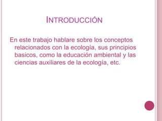 La ecología estudia las interacciones entre organismos y su ambiente. La educación ambiental genera conciencia sobre problemas ambientales y soluciones sostenibles. La autoecología considera cómo especies individuales reaccionan a factores; la demoecología estudia dinámicas de poblaciones; y la sinecología relaciones entre comunidades. La ecología aplica conocimientos para proteger la naturaleza.