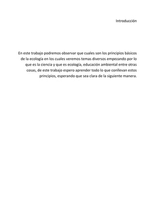 Este documento presenta los principios básicos de la ecología. Explica que la ecología es el estudio de los seres vivos y cómo se relacionan con su medio ambiente. Describe los pasos del método científico y define la ecología y la educación ambiental. Distingue entre autoecología, demografía y sinecología como las tres divisiones principales de la ecología. Concluye que la ecología estudia las relaciones entre los seres vivos y su medio ambiente y que la educación ambiental enseña a respetar el medio ambiente.