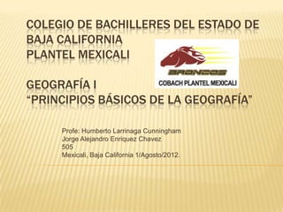 La presentación introduce la geografía como la ciencia que estudia la Tierra y las sociedades humanas. Explica que la geografía se divide en física, que estudia el medio ambiente natural, y humana, que analiza a las poblaciones y economías. También cubre las ciencias auxiliares de la geografía como la física, matemáticas, biología y ecología. Por último, resume los principios metodológicos de la geografía como la relación, causalidad, extensión y localización de fenómenos geográficos.