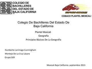 La geografía estudia la distribución espacial y temporal de fenómenos físicos, biológicos y humanos en la Tierra. Se divide en cuatro ramas: geografía general, física, humana y regional. Depende de ciencias auxiliares como la matemática, geología y sociología. Sus principios metodológicos incluyen analizar las relaciones, causas, distribuciones y evolución de los fenómenos geográficos a través del tiempo y el espacio.