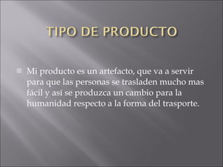 Este documento resume los requisitos para obtener una patente para una nueva invención. Explica que los artefactos que sirven para mejorar el transporte humano pueden ser patentados. Para solicitar una patente, se debe presentar una solicitud a una oficina de patentes que incluya una descripción del alcance técnico, antecedentes y descripción del producto. Una vez otorgada, la patente ofrece protección legal por 20 años.
