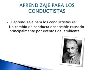 Este documento describe los principios básicos del aprendizaje desde las perspectivas conductista y cognitiva. Para los conductistas, el aprendizaje es un cambio observable en la conducta causado por estímulos ambientales, mientras que para los psicólogos cognitivos es un cambio en los procesos mentales y el conocimiento. También describe varios tipos de aprendizaje elemental como la habituación, sensibilización, pseudocondicionamiento e inhibición.