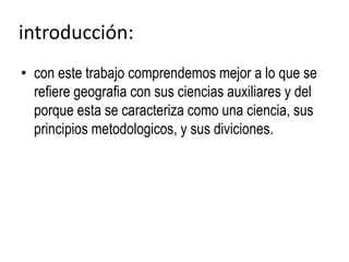Este documento presenta los principios básicos de la geografía. Explica que la geografía es la ciencia que estudia la Tierra, sus divisiones como la geografía general y física, y sus ciencias auxiliares como la física y la climatología. También describe los principios metodológicos de la geografía como la relación, causalidad, extensión, localización y distribución, evolución y generalidad.