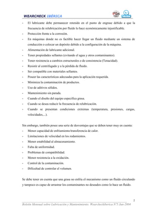 Este documento describe las grasas lubricantes, sus componentes y propiedades. Una grasa lubricante está compuesta principalmente de un aceite base (75-96%), un agente espesante (3-25%) y posibles aditivos (0-10%). El aceite base, que puede ser mineral u orgánico, determina las propiedades de lubricación de la grasa, mientras que el espesante retiene el aceite. Las grasas se usan cuando los aceites no son prácticos o para aplicaciones específicas como temperaturas extremas o lubricación a largo plazo