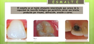 El documento resume los principios biológicos de la estructura dental, describiendo las características del esmalte y la dentina y cómo se cortan con instrumentos. Explica que el calor producido por los instrumentos rotatorios puede dañar los tejidos y la pulpa, y los factores que influyen en la respuesta pulpar como el espesor de la dentina remanente.