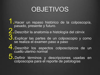 La colposcopía es un método para examinar el cérvix, vagina y vulva usando un microscopio que proporciona una vista magnificada e iluminada de estas áreas. Se desarrolló en los años 1920 y se ha utilizado desde entonces para diagnosticar lesiones precancerosas y cancerosas mediante la detección de características anormales en el epitelio. En la actualidad, la colposcopía sigue siendo una herramienta importante para el diagnóstico y tratamiento temprano del cáncer cervical, aunque su uso probablemente disminuirá