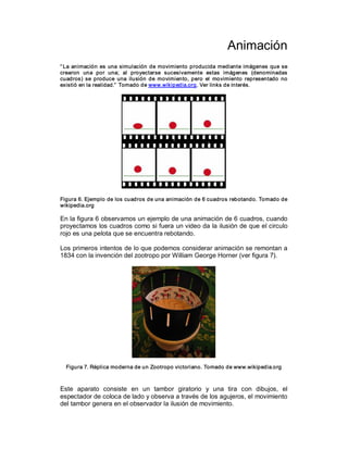 La animación es la ilusión de movimiento creada al proyectar imágenes fijas una tras otra. Los primeros intentos de animación incluyen el zootropo de 1834. Con el advenimiento del cine, se desarrollaron técnicas como la animación de dibujos cuadro a cuadro y la animación stop-motion. Walt Disney introdujo técnicas como la rotoscopia y el "in-betweening" que mejoraron la productividad y calidad. La animación por computadora usa interpolaciones matemáticas para estimar valores intermedios entre