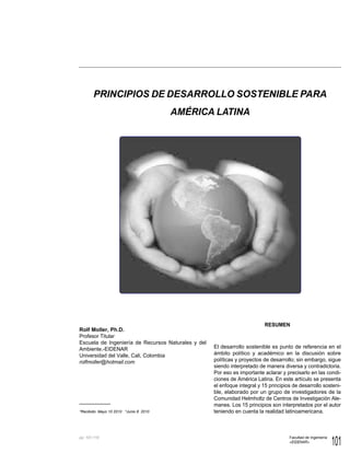 El documento presenta 15 principios de desarrollo sostenible elaborados por investigadores alemanes. Estos principios abordan el desarrollo de manera integral, considerando las dimensiones ambiental, social, económica e institucional. El autor interpreta estos principios en el contexto de América Latina, destacando la necesidad de satisfacer las necesidades humanas actuales y futuras de manera justa y respetando los límites planetarios.