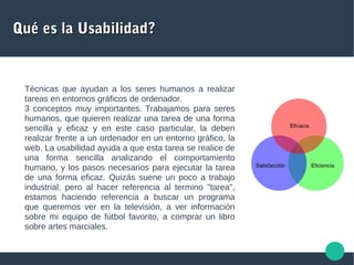 El documento trata sobre los principios de diseño de interfaces usables. Explica que la usabilidad se refiere a técnicas que ayudan a los humanos a realizar tareas en entornos digitales de forma sencilla y eficaz. También indica que la usabilidad es importante para cualquier sitio web porque los usuarios buscan completar tareas específicas al visitar un sitio. Finalmente, resume ocho reglas clave de usabilidad como priorizar a los usuarios, enfocarse en la velocidad y fiabilidad, simplificar el diseño y presentar la