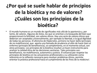 El documento resume los principales principios de la bioética, incluyendo la beneficencia, la no maleficencia, la autonomía y la justicia. Explica que el principio de autonomía es el más moderno porque surge del concepto de libertad personal. También discute los desafíos de aplicar los principios de la bioética en la práctica clínica debido a la subjetividad de cada situación y paciente.
