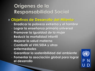 El documento presenta los principios fundamentales de la responsabilidad social como los Objetivos de Desarrollo del Milenio, el Pacto Mundial sobre derechos humanos, trabajo, medio ambiente y anticorrupción, y el Libro Verde de la UE sobre esta temática. También expone conceptos como la dignidad de la persona, el bien común, la subsidiaridad y la participación ciudadana.