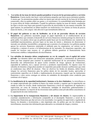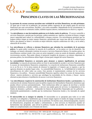 El documento describe 11 principios clave de las microfinanzas. Estos incluyen que las personas de bajos ingresos necesitan una variedad de servicios financieros, no solo préstamos; que el acceso a servicios financieros permite a las personas pobres aumentar sus ingresos e invertir; y que la sostenibilidad financiera es necesaria para alcanzar a un número significativo de personas necesitadas. También señala que las microfinanzas requieren la construcción de instituciones financieras locales y permanentes, y que la capacidad institucional y humana es