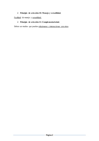 El documento describe 11 principios para la selección de medios TIC y 11 principios para su utilización. Los principios de selección incluyen considerar los objetivos educativos, las características de los estudiantes, el contexto y la calidad técnica. Los principios de utilización enfatizan el uso de estrategias didácticas efectivas, las actitudes del profesor y el desarrollo de habilidades cognitivas en los estudiantes.