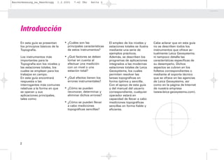 Este documento presenta los principios básicos de la topografía y describe los instrumentos clave como el nivel y la estación total. Explica cómo operar estos instrumentos para realizar mediciones topográficas comunes como determinar diferencias de altura, medir ángulos y distancias, y realizar replanteos. También cubre conceptos como coordenadas, errores instrumentales y programas de aplicación para estaciones totales modernas.