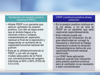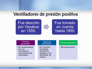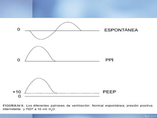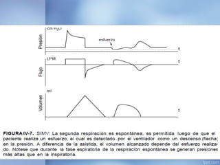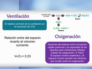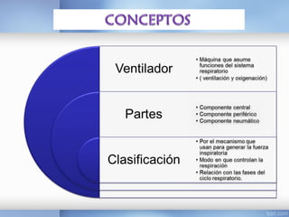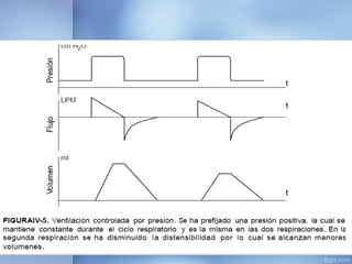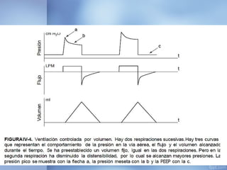 Este documento describe los principios básicos de la ventilación mecánica, incluyendo el objetivo de eliminar el CO2, los factores que afectan la oxigenación como el espacio muerto anatómico y alveolar, y los diferentes modos y parámetros de ventilación como el volumen controlado, la presión positiva y la relación de inspiración y espiración. Explica conceptos clave como tipos de respiración, modos de ventilación, y variables que se pueden ajustar en un ventilador como el volumen corriente