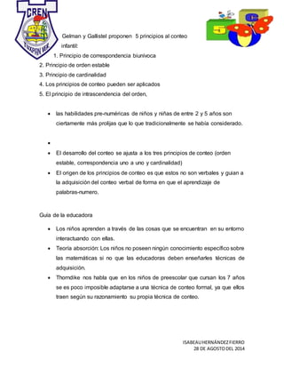 Jean Piaget estableció tres tipos de conocimiento: físico, convencional y lógico-matemático. Según Piaget, los niños no logran entender completamente el concepto de número hasta después de los 7 años. Gelman y Gallistel propusieron cinco principios del conteo infantil: correspondencia biunívoca, orden estable, cardinalidad, aplicabilidad y intrascendencia del orden. Diferentes teorías exploran cómo los niños aprenden conceptos matemáticos de forma informal a través de la interacción con objetos y el uso