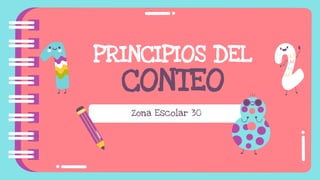 El documento describe varias actividades para enseñar los principios del conteo a niños de preescolar. Explica que los niños formarán equipos y jugarán un juego donde contarán objetos sacados de una caja. Luego discuten los principios del conteo como correspondencia uno a uno, orden estable, irrelevancia del orden y cardinalidad. Finalmente, ofrecen recomendaciones para favorecer estos principios a través de la manipulación de objetos y la resolución de problemas.
