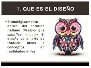 Este documento describe los principios y elementos básicos del diseño. Explica que el diseño es el arte de traducir ideas en realidades útiles. Luego describe nueve principios del diseño como el balance, énfasis, movimiento, patrón, proporción, ritmo, variedad y unidad. Finalmente, detalla siete elementos del diseño como el punto, línea, forma, valor, espacio, textura y color.
