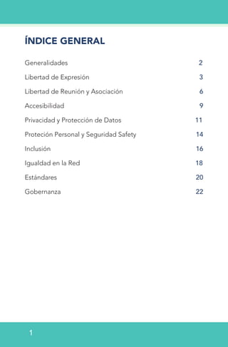 Este documento presenta principios democráticos para garantizar una internet abierta, esencial para la participación ciudadana y el fortalecimiento de la democracia. Destaca la importancia de la libertad de expresión, reunión, accesibilidad y privacidad en línea, así como las amenazas que enfrentan estas libertades en entornos políticos cambiantes. La guía busca ayudar a activistas y organizaciones a promover y proteger estos derechos humanos en el ámbito digital.